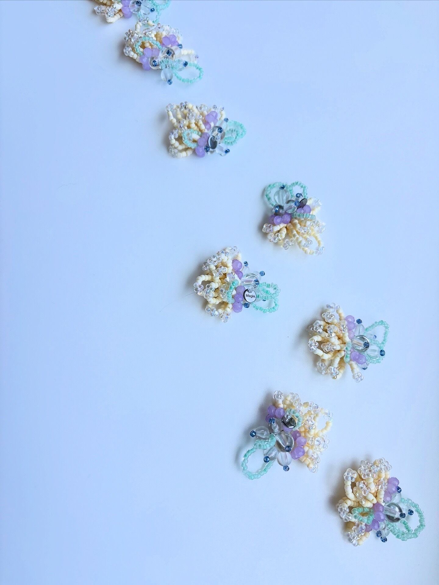 個性的なデザインが目を引くフリルビーズピアスイヤリング!クリームとパープルを基調に、アクセントとしてミントブルーが使用されており、あなたのスタイルに新たな華やかさを加えてくれます。日常のコーディネートに素敵なアクセントを与え、特別な日にも活躍するアイテムです。このピアスイヤリングを身に着けることで、一味違った魅力を引き出せます。