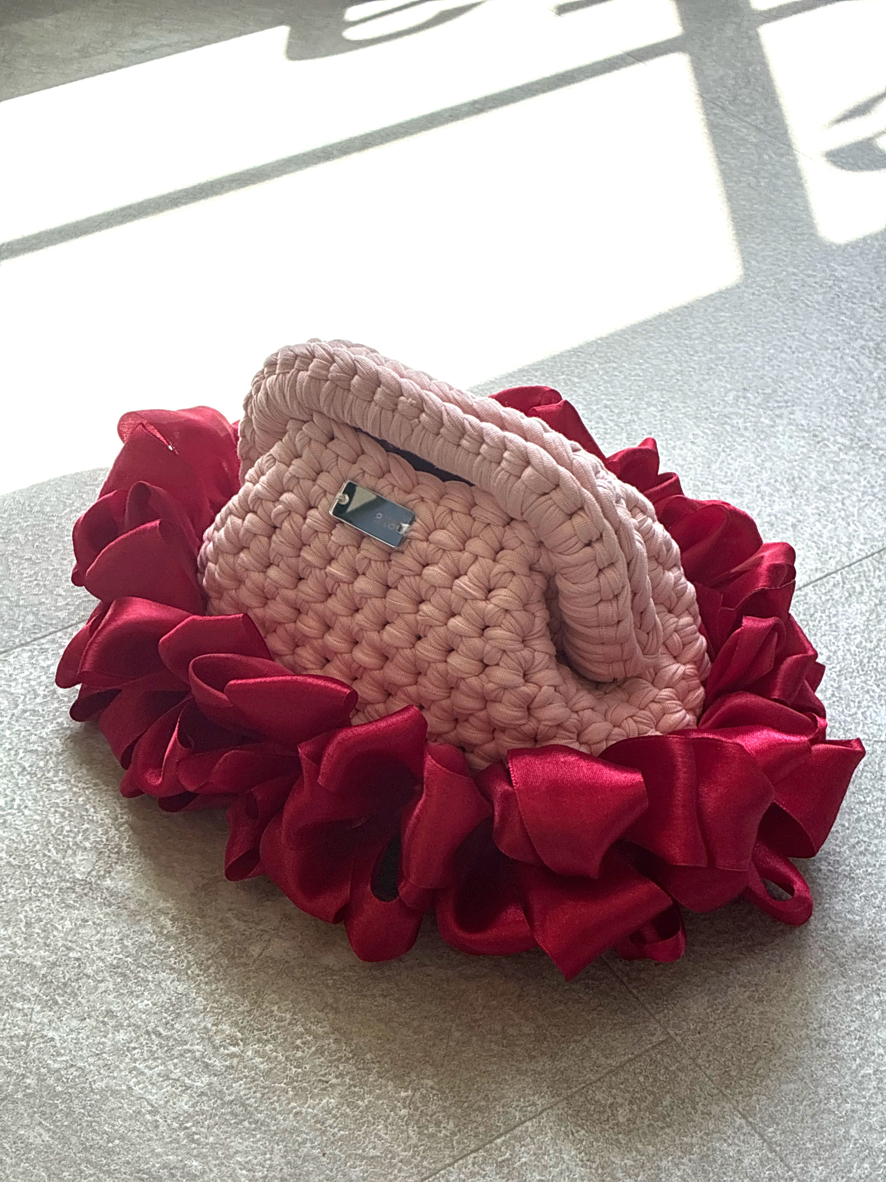 ピンクと赤の絶妙なコンビネーションが印象的なオシャレなクラッチバッグです。「甘すぎない大人スタイル」。手触りの良いTシャツヤーンを使用しているため、肌にも優しく、毎日のお出かけに最適です。あなたのコーディネートに華を添えてくれることでしょう!