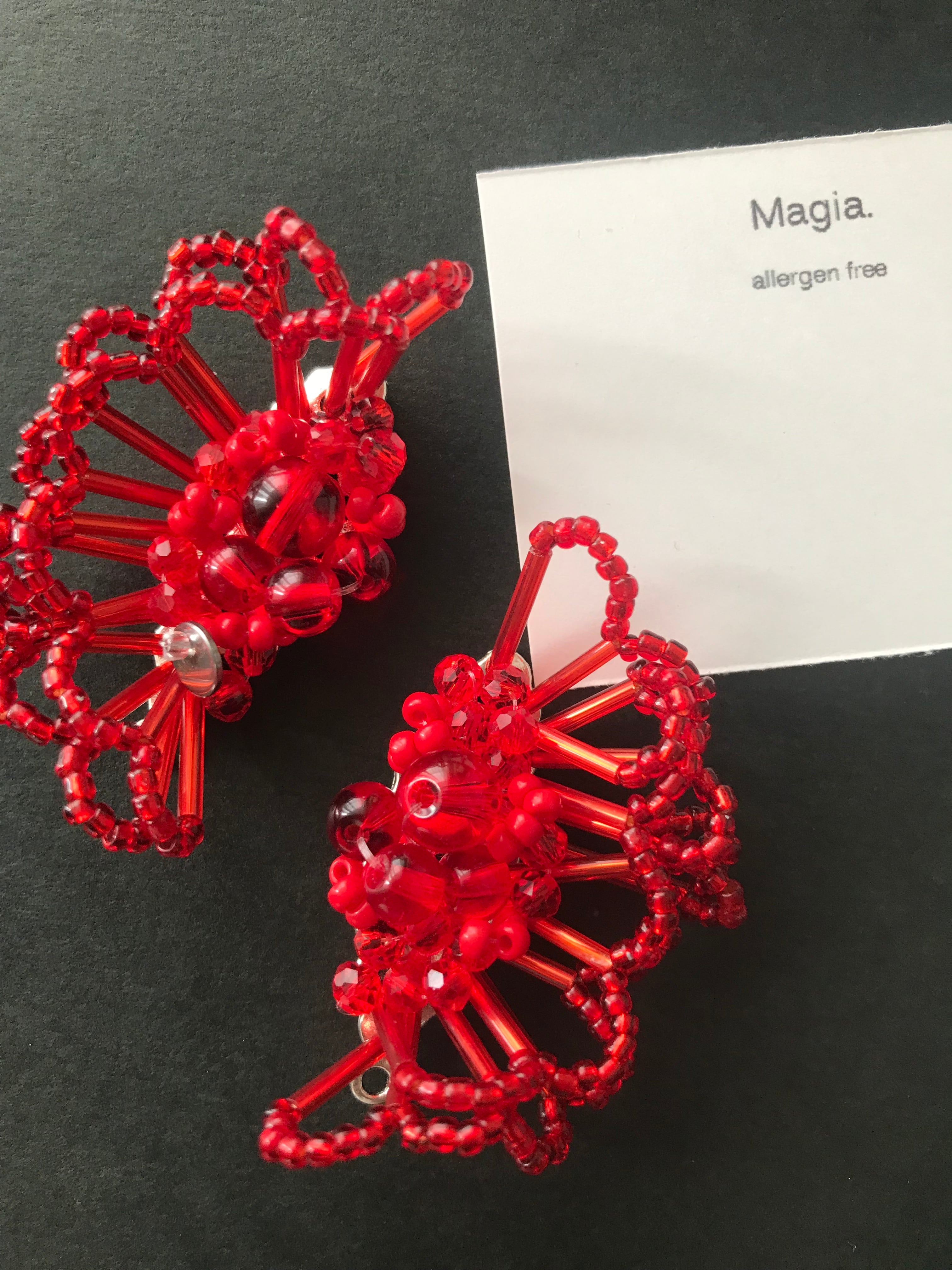 真っ赤なアルカナの輝きが耳元で華やかに輝くフリルビーズピアスイヤリング。その艶感は心を奪われるほど魅力的で、どんなファッションにも華を添えてくれます。アルカナは古代の秘儀や神秘を象徴する言葉。その名にふさわしい、神秘的な美しさのピアスイヤリング。細かいビーズが緻密に編み込まれております。このピアスは、コーディネートのアクセントとして、ひとつひとつに個性があり、特別なアイテムとしてお楽しみいただけます。。フリルデザインとビーズが絶妙に組み合わさった、遊び心満載のアクセサリー。