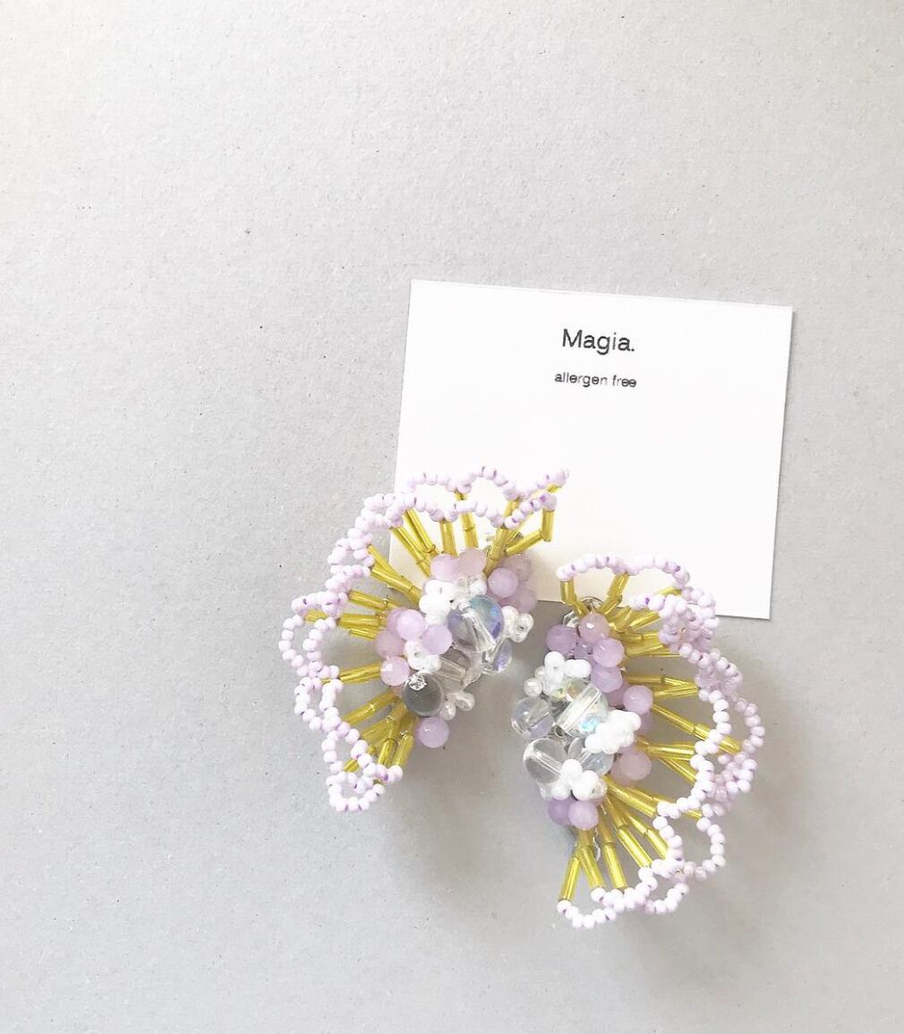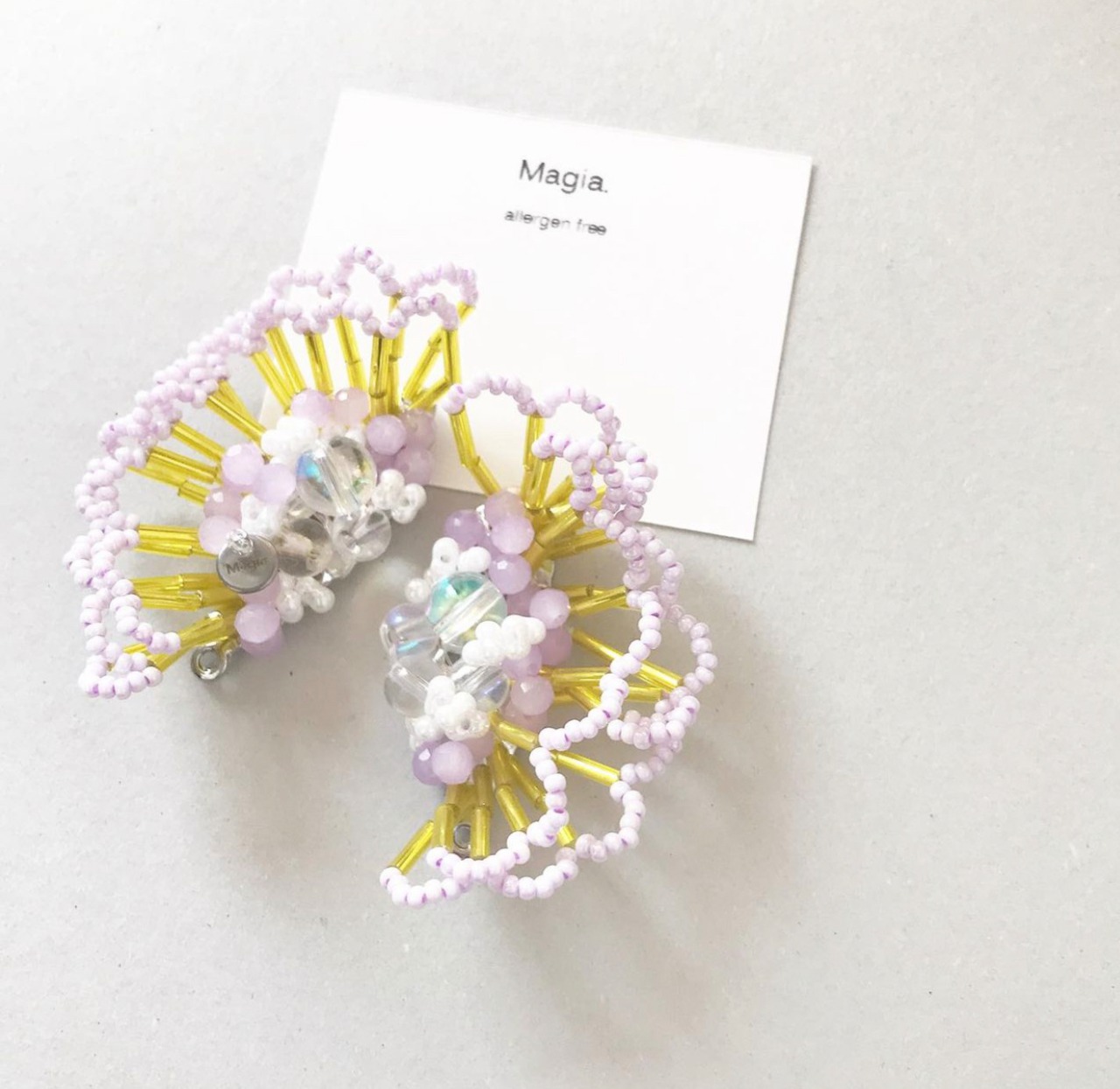 ミルキーなパープルとイエローのカラーリングが優しい雰囲気を演出するフリルビーズピアスイヤリング。どんなコーディネートにも映える存在感たっぷりのアクセサリーです。装着するだけで女性らしさを引き立ててくれます。細かいビーズが緻密に編み込まれております。このピアスは、コーディネートのアクセントとして、ひとつひとつに個性があり、特別なアイテムとしてお楽しみいただけます。シンプルでありながらもエレガントな印象を与えるため、普段使いからパーティーシーンまで幅広く活躍します。。フリルデザインとビーズが絶妙に組み合わさった、遊び心満載のアクセサリー。
